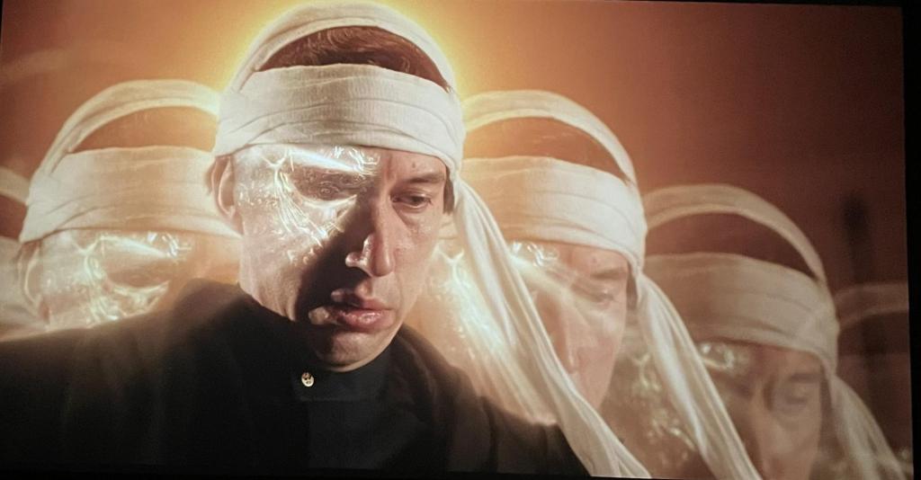 However, I wanted to go for something a little more abstract to discuss what I think the film is exploring in part. The shot in question is Cesar’s face reveal after he got shot in a fan encounter. The reveal of his glistening golden visage has a striking resemblance to the Phantom’s unmasking in various musical and movie incarnations. This feels particularly intentional, given Adam Driver’s physicality early in the film that resembles a child trying to strut about the stage (in a semi spooky fashion) as literature’s most famous Erik.