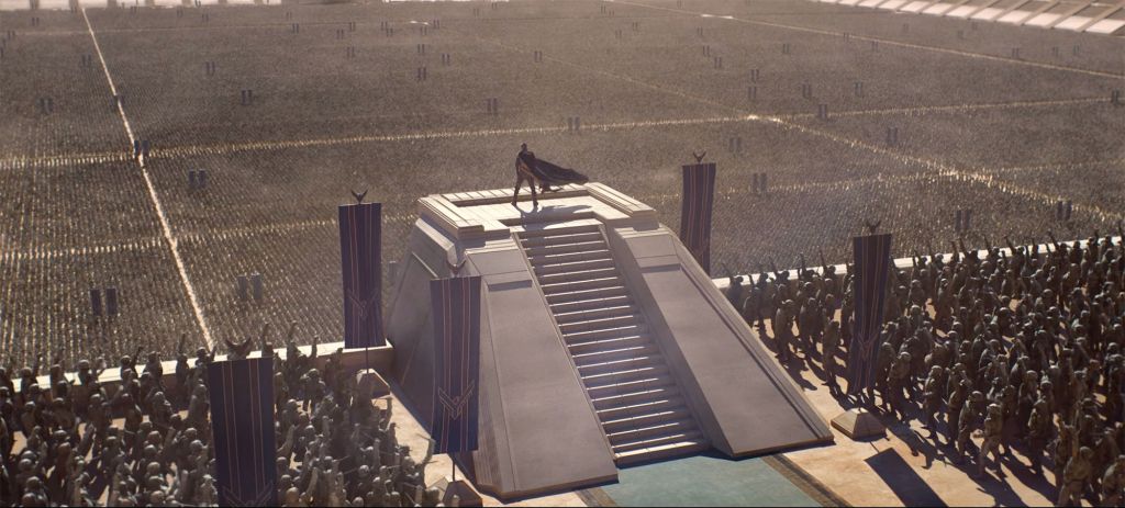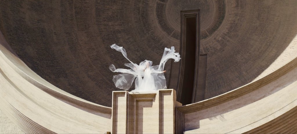 The best elements of the first preview for Part Three demonstrate a firm understanding of these more difficult concepts. For one, the music (starting with soothing humming and culminating in Paul’s intense, warlike chant) illustrates that the external forces (such as the Harkonnens and Sardaukars) and Arrakis itself are no longer threats. The heroes and their supremacy of Dune are the tyrants they previously fought against. The above two shots demonstrate this in spades, whether it’s the first one in its evoking of Rabban overlooking spice production at the beginning of part one or Alia Atreides being like a literal siren for her brother’s rule.